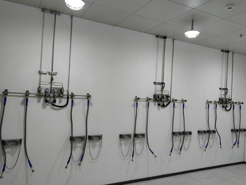 2.4N氦氣組長線應用OD3/8”(6.35mm)的線路,0.5Mpa壓下作量會達8M3/每小時,完成提供常規性用氣供給,支線應用OD1/4”(6.35mm)的線路。用焊接生產三通管分離出來支路來對專用設備實行供氧。
